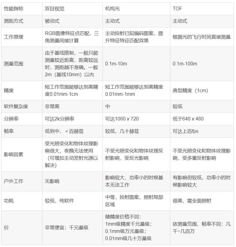 首页 动态 目前主流3D视觉技术各有什么优劣势?如何选择最Match的工业3D相机? 目前主流3D视觉技术各有什么优劣势?如何选择最Match的工业3D相机? 技术科普 2024-08-12 浏览量:1984 什么3D相机?3D相机与2D相机相比有什么差别? 3D相机,也被称作深度相机,与传统的2D相机相比,它能够多获取物体到相机的距离信息,即深度信息,结合2D图像的X和Y坐标,可以计算出每个点的三维坐标,从而实现三维重建、目标定位、导航避障等功能。 3D机器视觉可以完成许多2D机器视觉无法完成的任务。 以零件检测为例,下图零件表面有一划痕、边沿有凹陷。传统的2D机器视觉只能依靠表面图像颜色的不连续来判断是否缺陷,但此案例中,缺陷和零件表面反光颜色接近,判断难度很大,3D相机可以得到表面凹凸的深度信息,从而准确的判定划痕和边缘的凹陷。 此外,目前3D视觉技术在高精度检测、高精度测量(例如弯管、不规则件)、智能分栋、装配(引导机械臂在三维空间内避障和定位)、物流车导航等更多场景中实现了相较于2D机器视觉更为广泛的应用覆盖。 主流3D技术对比 3D相机的工作原理主要有三种技术:双目立体视觉、结构光和ToF(Time of Flight),还有其他市面上常见和新技术发展起来的相机种类。 1. 双目立体视觉基于视差原理并利用成像设备 从不同的位置获取被测物体的两幅图像,通过计算图像对应点间的位置偏差来获取物体三维几何信息。 一般立体视觉相机指的是被动式双目立体视觉相机,而主动式双目立体视觉相机是在双目立体视觉的基础上,增加了主动发射光源(通常是红外光)来辅助获取深度信息的相机系统,这种系统结合了被动双目视觉和主动发射光源的优势。 1. 被动式双目立体视觉相机 【优点】1)硬件要求低,功耗低,成本低。普通 CMOS 相机即可; 2)室内外都适用,尤其适合在户外工作; 3)适用于纹理丰富的场景。 【缺点】1)对环境光照非常敏感。光线变化导致图像偏差大,进而会导致匹配失败或精度低; 2)不适用单调缺乏纹理的场景。双目视觉根据视觉特征进行图像匹配,没有特征会导致匹配失败; 3)计算复杂度高。该方法是纯视觉的方法,对算法要求高,计算量较大; 4)基线限制了测量范围。测量范围和基线(两个摄像头间距)成正比,导致无法小型化。 2. 主动式双目立体视觉相机 通常是指在双目立体视觉的基础上,增加了主动发射光源(如红外光)来辅助获取深度信息的相机系统。这种系统结合了被动双目视觉和主动发射光源的优势。国内开云电子kaiyun智能是研究该领域的专业企业。 【优点】1)低光场景可用:可在户外使用,同时也可在低光或无光环境工作,提高图像可见度和深度测量准确性; 2)增强纹理信息:为缺乏纹理的表面增加必要纹理信息,适合表面光滑和颜色单一场景; 3)降低环境光干扰:使用红外或特定波长的光源可以减少环境光变化对系统性能的影响。 【缺点】1)功耗增加:使用外部光源可能会增加系统的功耗,尤其是在需要长时间运行的应用中。 2)安装和校准:需要更精确的安装和校准过程,以确保光源和相机之间的正确对齐。 结构光 通过近红外激光器,将具有一定结构特征的光线投射到被拍摄物体上,再由专门的红外摄像头进行采集。这种具备一定结构的光线,会因被摄物体的不同深度区域,而采集不同的图像相位信息,然后通过运算单元将这种结构的变化换算成深度信息,以此来获得三维结构。 根据编码图案不同一般有:条纹结构光、编码结构光、散斑结构光。 【优点】1)方案成熟,相机基线可以做的比较小,方便小型化。 2)资源消耗较低,单帧 IR 图就可计算出深度图,功耗低。 3)主动光源,夜晚也可使用。 4)在一定范围内精度高,分辨率高,分辨率可达 1280x1024,帧率可达 60FPS。 【缺点】1)容易受环境光干扰,室外体验差。 2)随检测距离增加,精度会变差。 TOF 顾名思义是测量光飞行时间来取得距离,具体而言就是通过给目标连续发射激光脉冲,然后用传感器 接收从反射光线,通过探测光脉冲的飞行往返时间来得到确切的目标物距离。 因为光速激光,通过直接测光飞行时间实际不可行,一般通过检测通过一定手段调制后的光波的相位偏移来实现。 TOF 法根据调制方法的不同,一般可以分为两种:脉冲调制(Pulsed Modulation)和连续波调制 (Continuous Wave Modulation)。 脉冲调制需要非常高精度时钟进行测量,且需要发出高频高强度激光,目前大多采用检测相位偏移办法来实现 TOF 功能。简单来说就是,发出一道经过处理的光,碰到物体以后会反射回来,通过捕捉来回的时间计算距离。 【优点】 1)检测距离远:在激光能量够的情况下可达几十米。 2) 受环境光干扰较小。 【缺点】 1)对设备要求高,特别是时间测量模块; 2)资源消耗大。 该方案在检测相位偏移时需要多次采样积分,运算量大。 3)边缘精度低。 4)限于资源消耗和滤波,帧率和分辨率都没办法做到较高。 三种技术性能对比 上一个:【最全选型攻略】挑选合适的工业相机,必须提前考虑12要素! 返回列表 下一个:3D机器视觉可以完成许多2D机器视觉无法完成的任务。 更多新闻推荐 端到端 更易用丨开云电子kaiyun®散料运输动态监测与预警系统全新上市 新品上市 2025-02-20 小尺寸 更灵活丨开云电子kaiyun3D相机PEA020-800-Y80S上新,助力多场景智造升级 新品上市 2024-09-29 【最全选型攻略】挑选合适的工业相机,必须提前考虑12要素! 