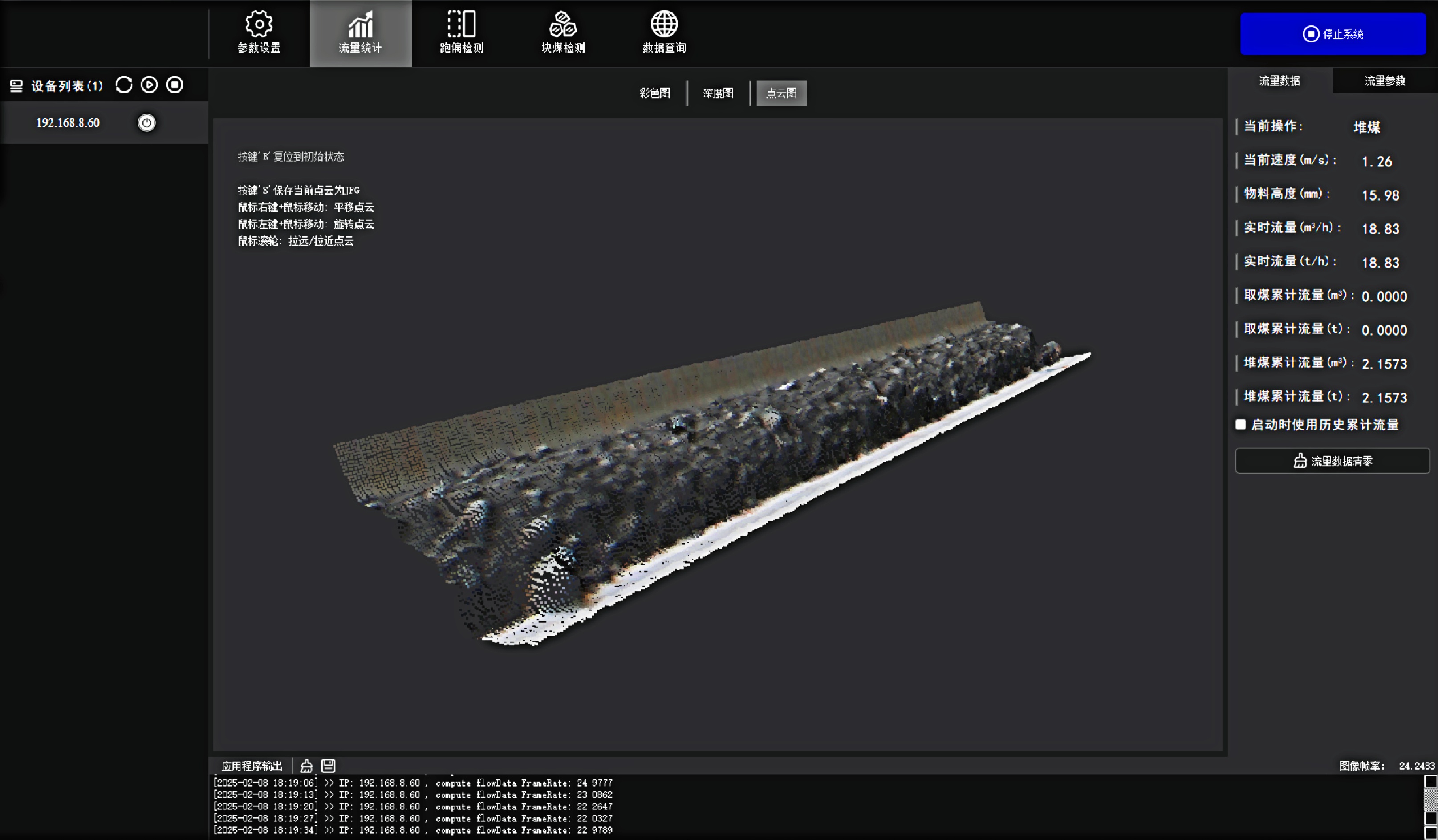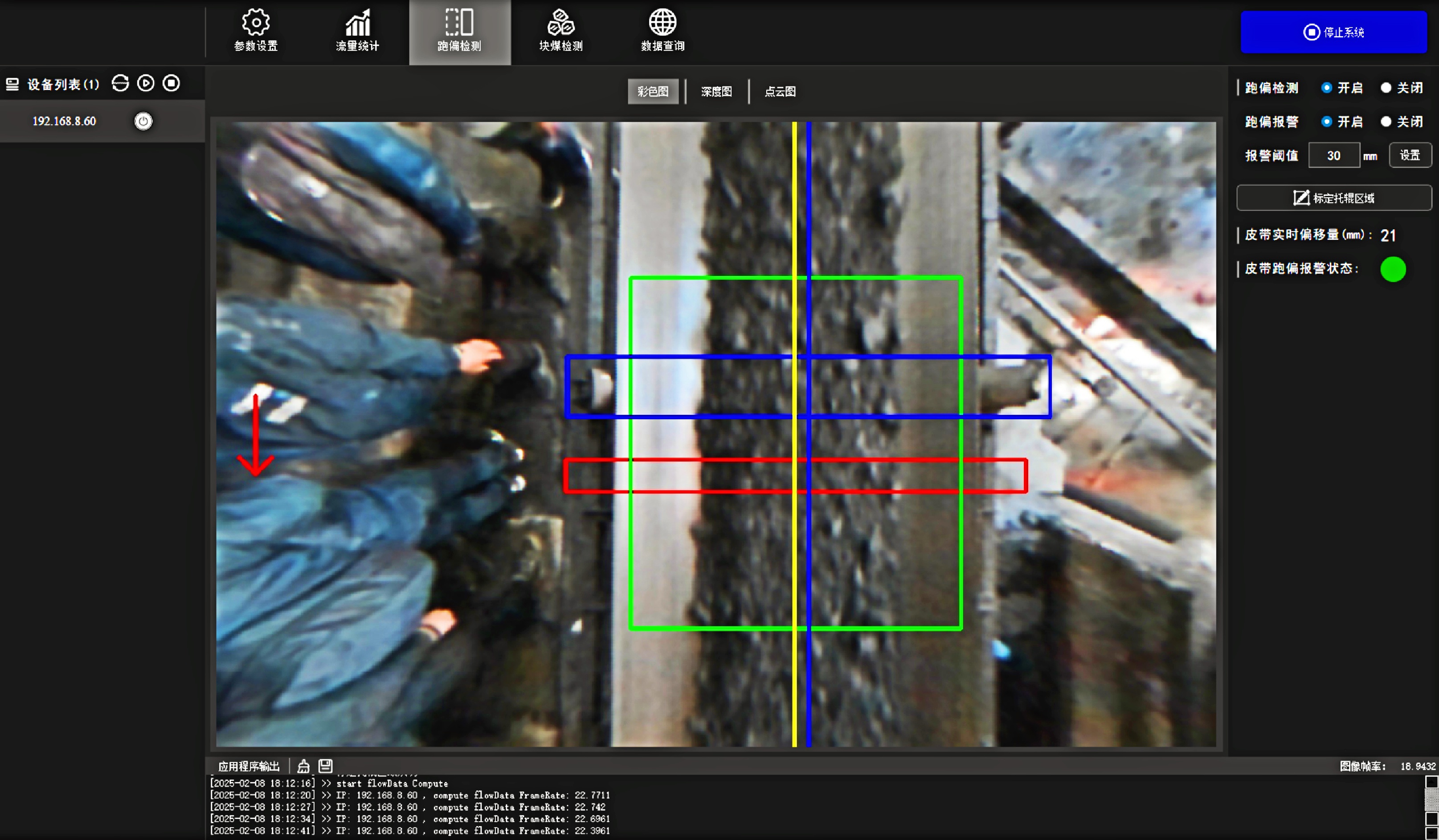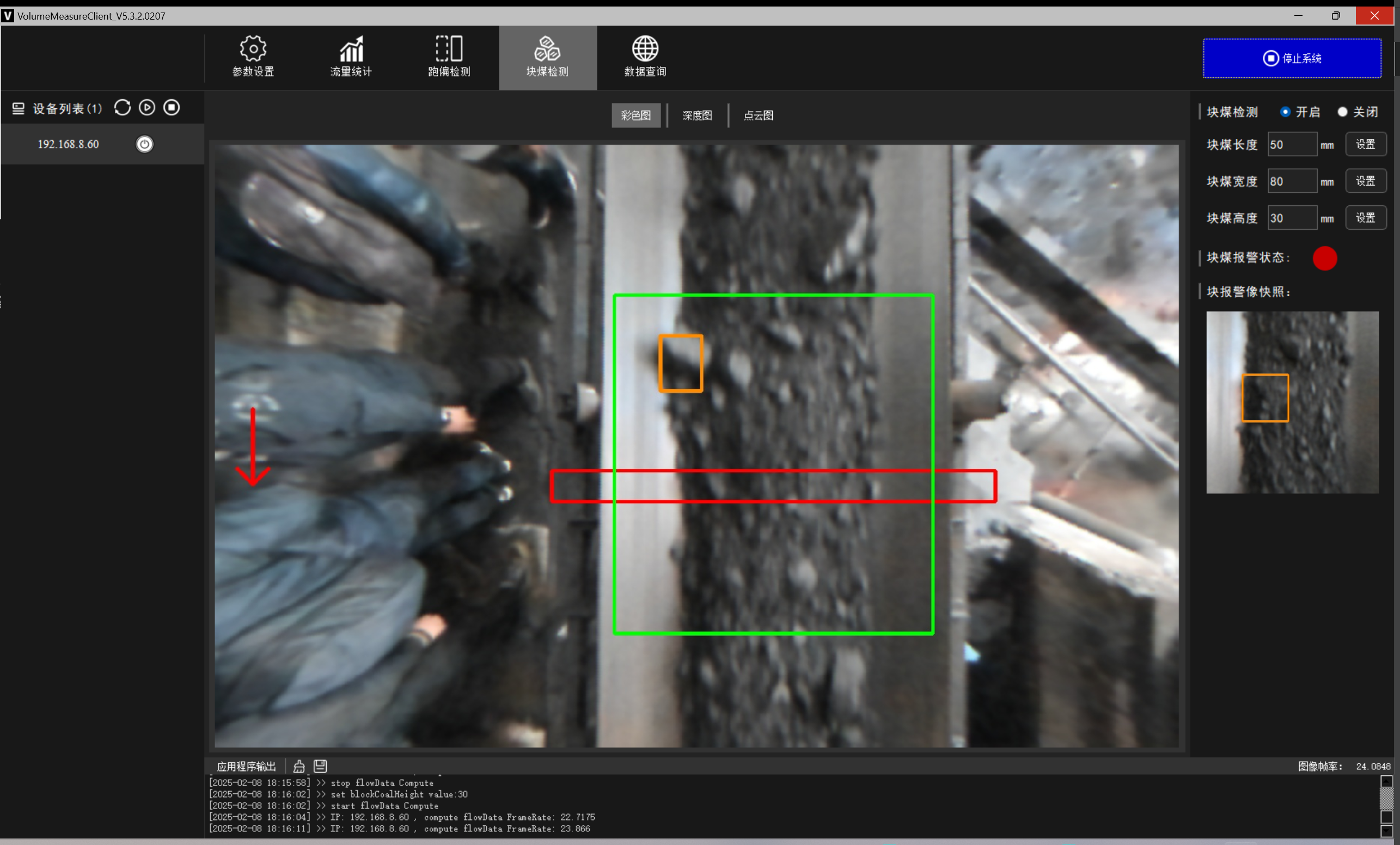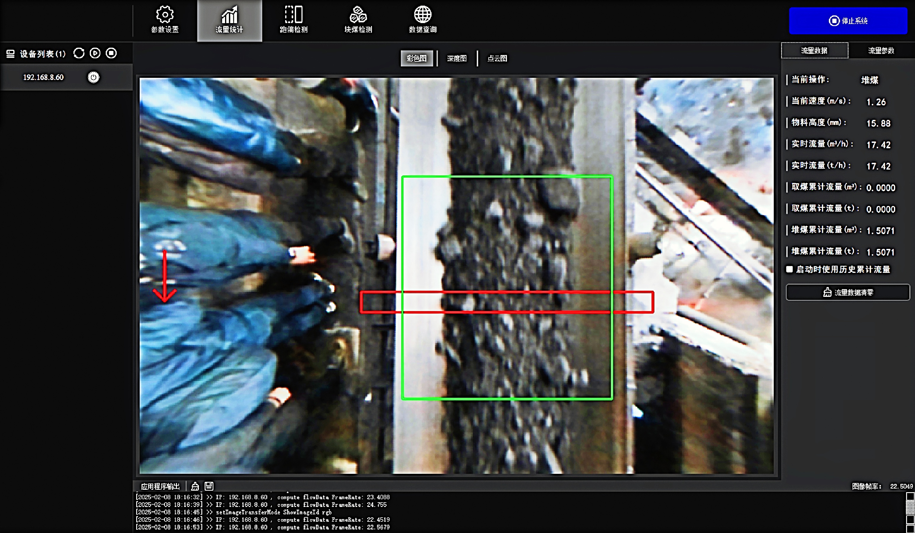 料型料流监测一体机系统 开云电子kaiyun®智能料型料流监测系统由智能煤流监测一体机搭配监测平台构成,实时监测输送带工业散料流量,包含煤矿、砂石骨料、粮食等 首页 产品 3D相机 开云电子kaiyun® 料型料流监测一体机 RBGD智能一体机 开云电子kaiyun® 料型料流监测一体机 系统由智能料流监测一体机搭载监测平台构成,由稳定的底层硬件、嵌入式算法软件和自动化监测管理平台实现服务,实时采集高精度煤流RGBD数据,完成场景的实时三维彩色点云重建,对高速运动的皮带输送机进行精细化管理调控→应用场景: 煤矿检测系统精细化管理 定制解决方案 应用场景 煤流统计支持皮带速度6m/s,环境适应强,部署简单,无需改造现场环境即可安装块煤检测通过三维点云数据分析,能够对块煤的尺寸进行精确测量,准确计算出块煤的长、宽、高等尺寸数据输送带自动测速自动测量高速运动中的输送带速度,确保及时发现异常波动输送带跑偏检测通过获取的输送带三维尺寸位移信息,对皮带左右边缘位置与阈值比较并判断是否偏离正常轨道,同时计算跑偏幅度和方向煤流高度检测对煤流高度精准检测,能够有效管理煤流的分布、运输量、堆积情况 产品特点 测量误差<5%在高速动态检测上,测量精度可达毫米级,测量结果与实际煤量误差小于5%工业级硬件设计采用IP65防护等级和工业级防尘防水,可在高粉尘、大温差的情况下稳定运行室内暗光环境适用在室内、地下、夜晚能稳定测量,无需补光部署简单,安装便捷,支持二次开发出厂相机内参标定,可快速部署集成,无需改变现场环境即可安装,实施速度快,调试简单,系统易于维护接口丰富,数据直传丰富的系统对接接口,可直接对接PLC、变频器、服务器,快速完成精细化皮带控制大景深、大视野,多范围应用测量皮带宽度达2.4m;煤堆高度达1.5m边缘计算架构,实时测量使用边缘计算架构,将多种智能算法在边缘端实现,保证数据实时传输 性能参数 RGBD智能一体机型号VEA020-800-X180参数技术原理主动式双目基线长度180mm测量范围0.9m~2.5mZ向精度1m:≤1.3mm帧率25fps数据类型深度图、彩色图、红外图、点云图分辨率彩色图像:1280x800/640x400 ; 深度图像:1280x800/640x400像素形式彩色图: 8位三通道图 ;深度图:16位单通道图彩色视场角Horizontal 90°,Vertical 64°深色视场角Horizontal 90°,Vertical 64°RGBD同步对齐支持曝光类型全局曝光曝光控制自动/手动流量统计技术参数推荐安装高度1.2m~1.5m覆盖输送带范围0~3m支持输送带速度0~6m/s,推荐0~4m/s流量统计精度误差<5%物料高度测量支持,精度毫米级自动测速支持,安装位置需要具备照明条件实时流量统计 支持,统计周期支持配置跑偏检测支持,跑偏精度可达毫米级块煤检测 支持,支持块煤参数定义数据存储支持5年以上体积结果化数据存储数据查询支持按小时,天和月等维度查询实时视频支持rtsp协议彩色图像拉流点云数据支持彩色点云拼接数据输出协议支持TCP硬件参数数据传输接口千兆以太网相机供电要求12V~24V DC功耗18w结构尺寸(mm)270mm x 80mm x 44mm重量(g)1200g防护等级IP65温度工作温度:-25 ~50°C ;存储温度:-30 ~80°C湿度20% ~ 85%散热方式被动散热软件支持开发环境Windows/Linux数据协议TCP数据查看流量统计客户端 点云图 资料下载 开云电子kaiyun® 煤流体积测量输送带监测管理平台 产品资料下载 请填写此表格并点击提交后,程序会自动下载文件 *合作意向 请选择 商务合作 媒体合作 投资者合作 *电话 *姓名 公司 行业 职位 邮箱 地址 您的留言 提交并下载资料 您也可以拨打我们的客服电话:010-81046658 联系我们
